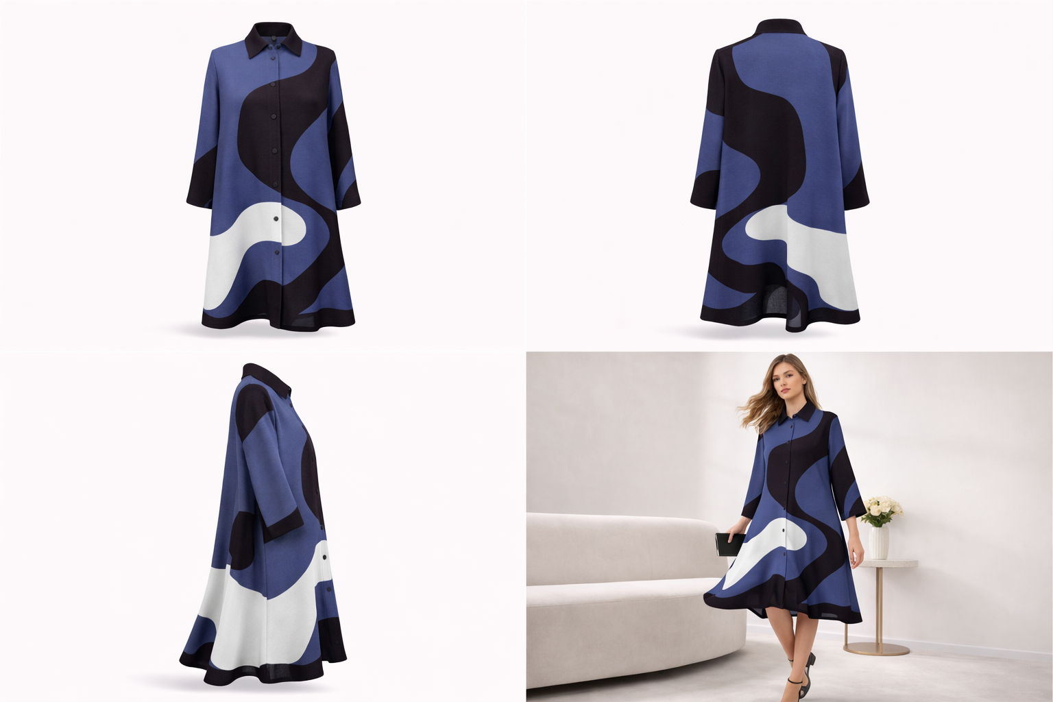 The bold abstract wave print combines deep midnight black, rich steel blue, and soft ivory white, creating a sophisticated contrast that feels both modern and timeless. The flowing graphic pattern moves organically across the dress, making each angle visually striking.