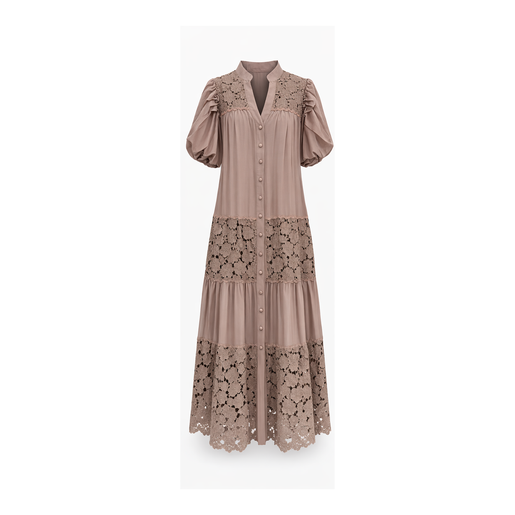 This beautifully crafted cotton lace tiered dress combines effortless elegance with everyday comfort. Designed with delicate floral lace panels, soft gathered tiers and feminine puff sleeves, this dress creates a relaxed yet sophisticated silhouette.